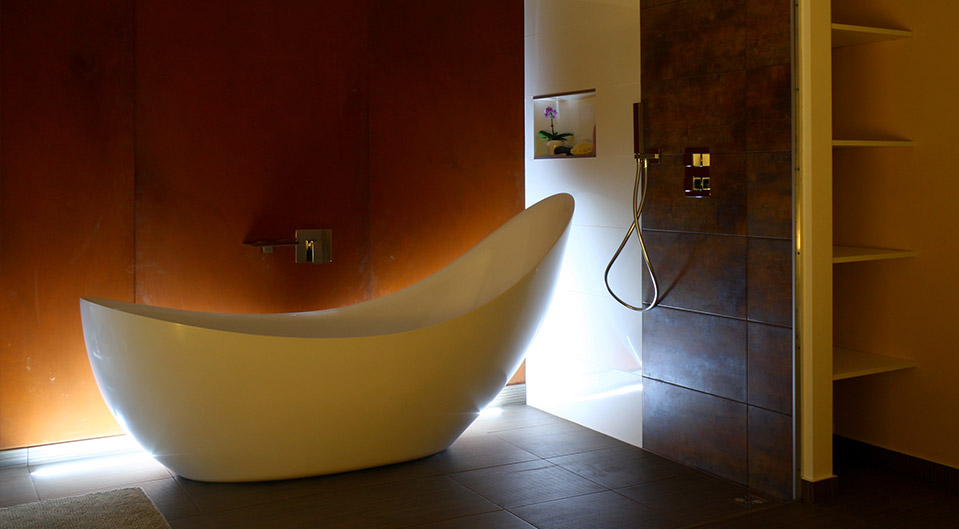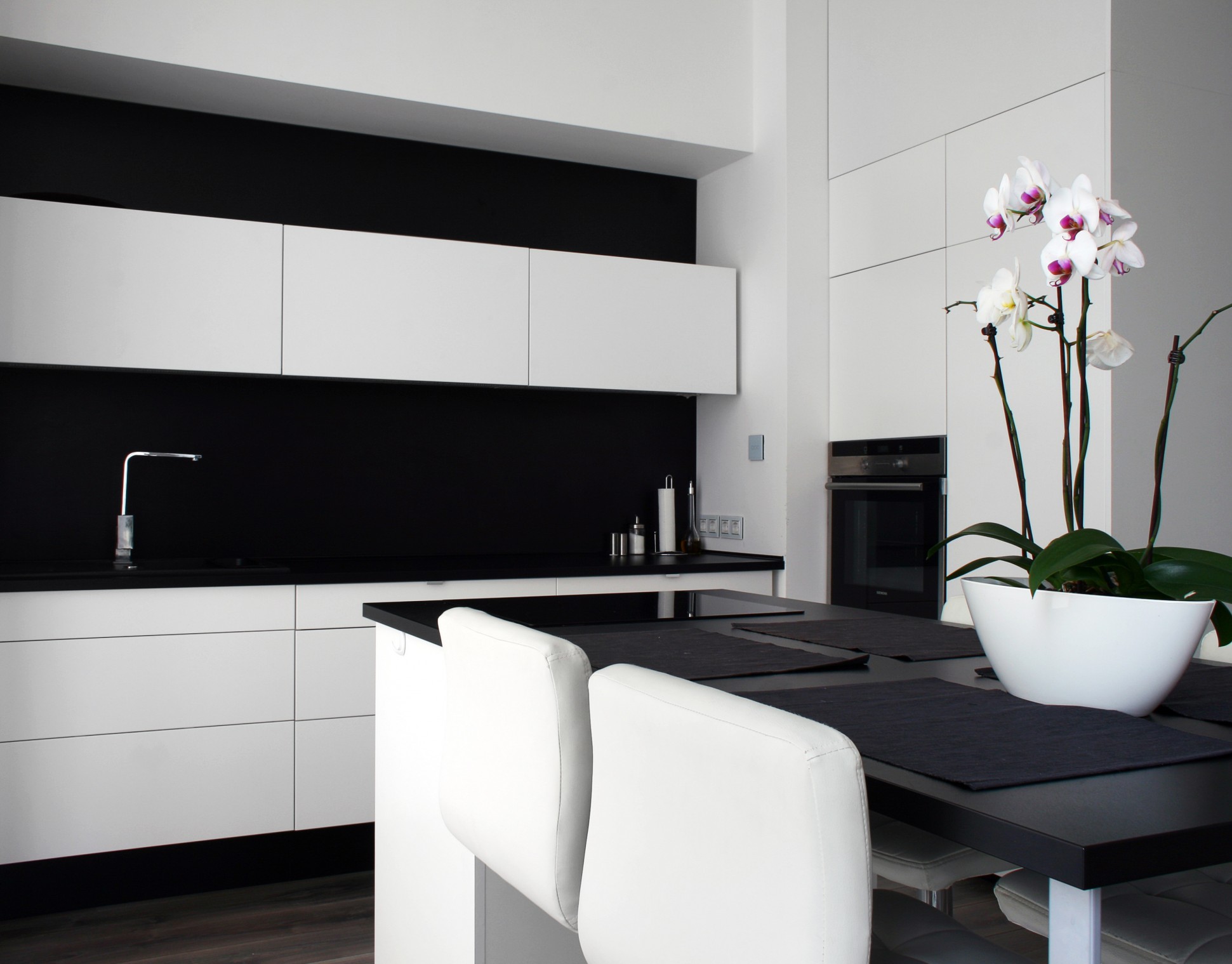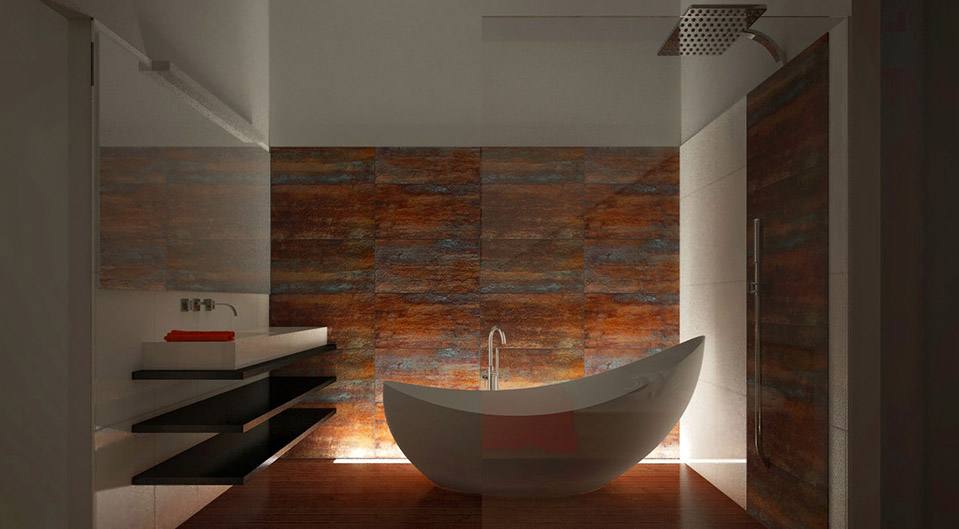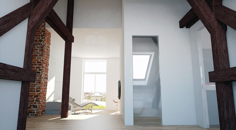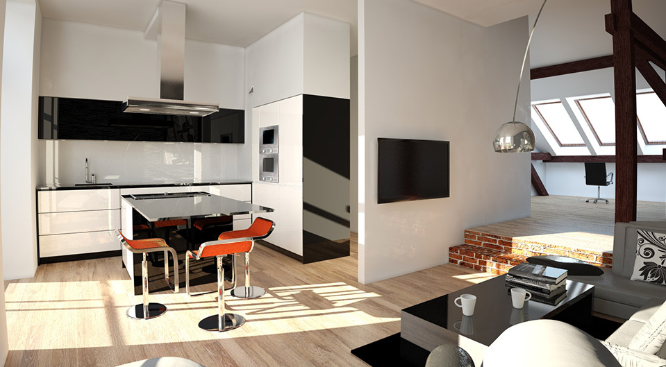 Navrhli jsme minimalistickou kuchyň v černobílé barvě, ale přesto nepůsobí chladně. Byt se nachází v podkroví a jeho součástí jsou krovy, které byt zůtulní. Koupelnu jsme navrhli s vanou i sprchovým koutem. Atypickým designovým prvkem je corten, který je v kontrastu s bílým lakem vany.