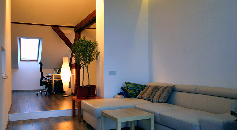 Mladý pár se rozhodl pro minimalistický styl. Upřednostňují nekontrastní barvy. Přáli si kuchyň spojenou s obývacím pokojem, samostatnou pracovnu a odpočinkové místo pro ně měla tvořit koupelna s volně stojící vanou.