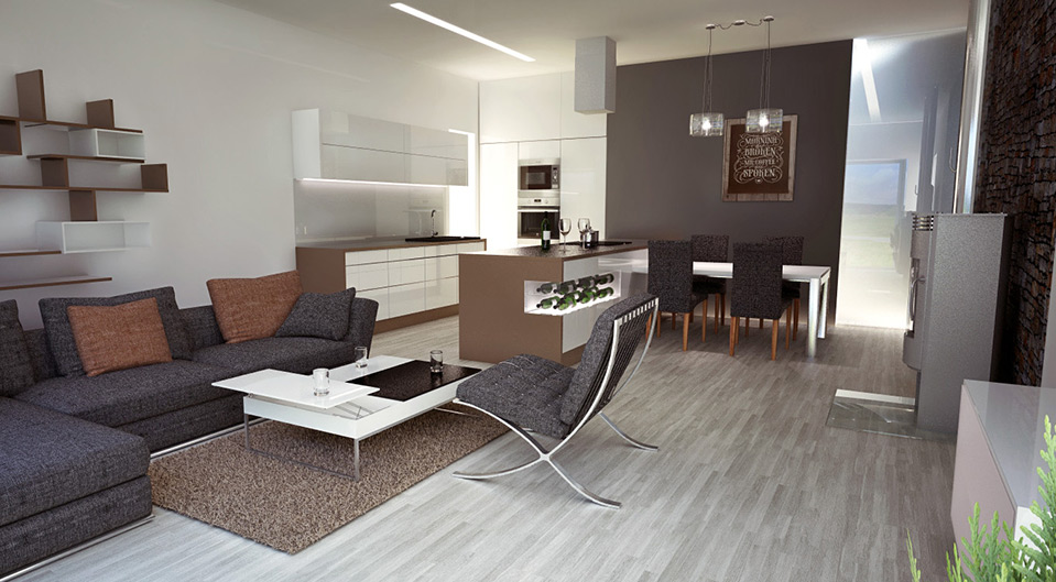 Pro mladý manželský pár jsme měli navrhnout obývací místnost s kuchyňí a jídelnou. Pokoj má být jednoduchý, v moderních teplých barvách, prostorný a bezpečný pro malé dítě.